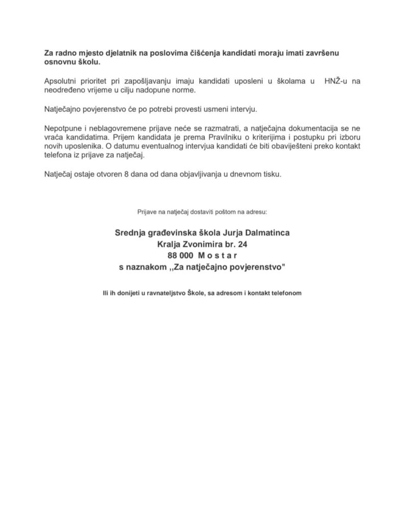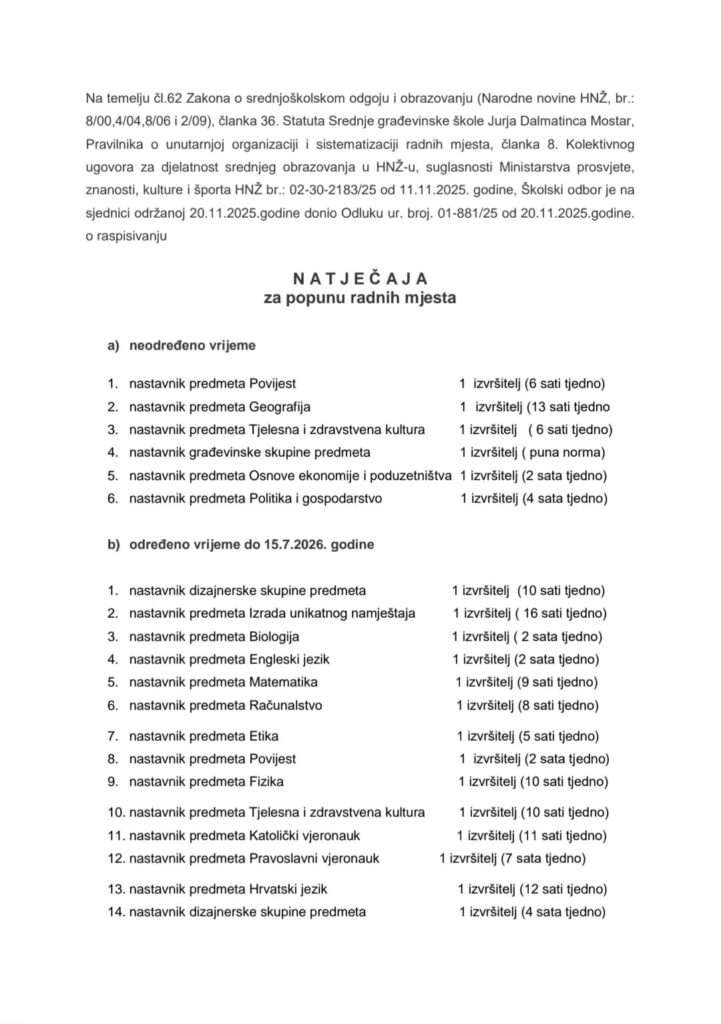 Natječaj za popunu radnih mjesta